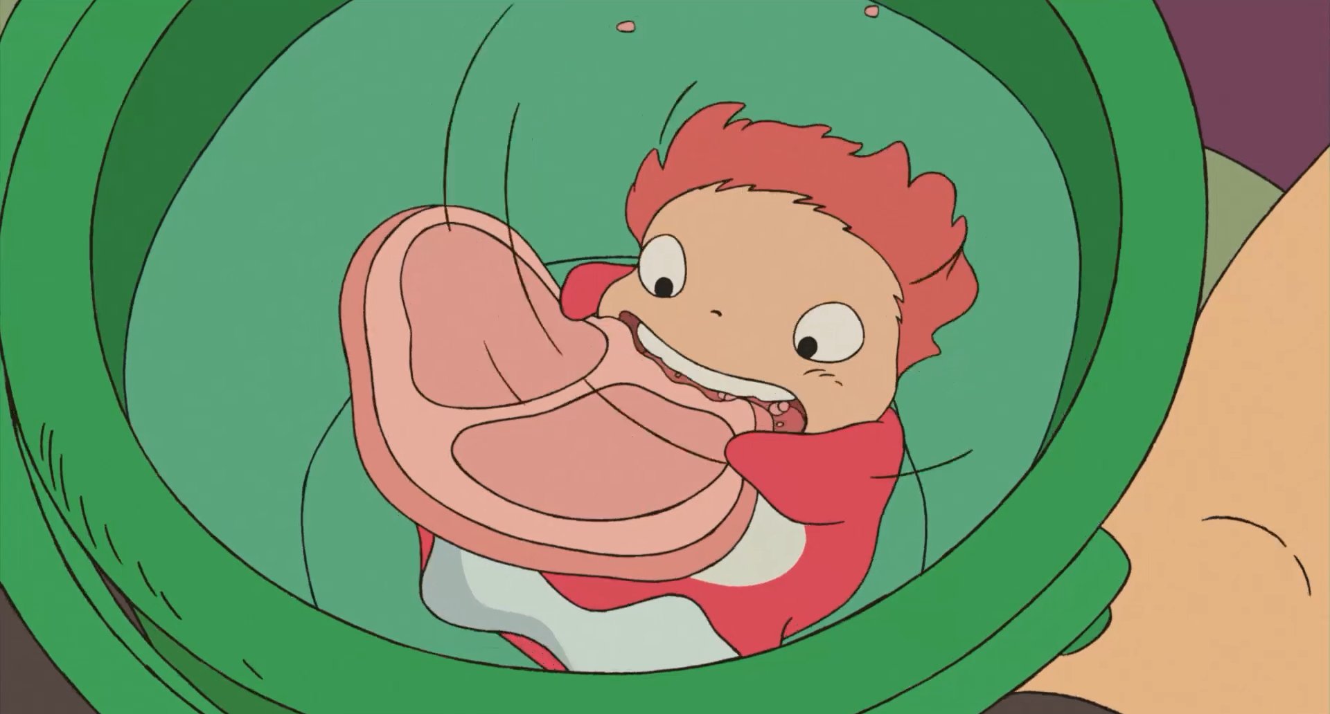 My favorite part of the movie is when Ponyo and Saskue goes to find Saskue's mother Lisa. Ponyo uses her magical powers to make Saskues toy boat bigger they but a candle in to use it as fuel and set sail. While their sailing we see that the whole town is under water and all the animals are so cute i love them soo much. When Ponyo sees the problem she has caused she does get a little underwhelmed so her magic wares off but they still mange to find Lisa. I also think that Ponyo is such a great main character she is so silly and i sometimes see myself in her thats one of the reasons i love this movie as well. Anyways as Ponyo says "HAM!".